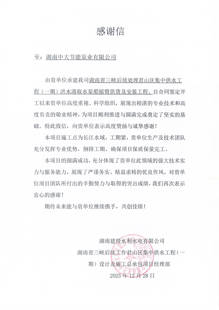 近日,我司收到湖南建投水利水电有限公司湖南省三峡后续工作君山区集中供水工程(一期)设计及施工总承包项目经理部发来的感谢信,信中对我司在浮船项目合作中的专业表现、履约能力及责任担当给予高度肯定与诚挚感谢。